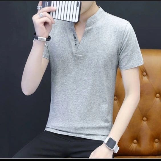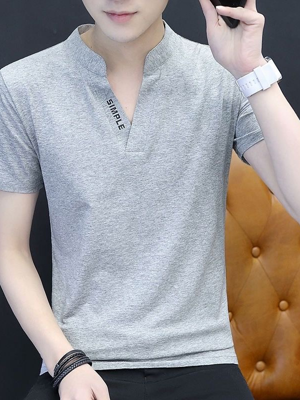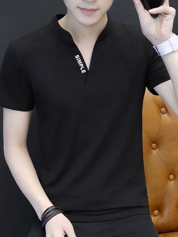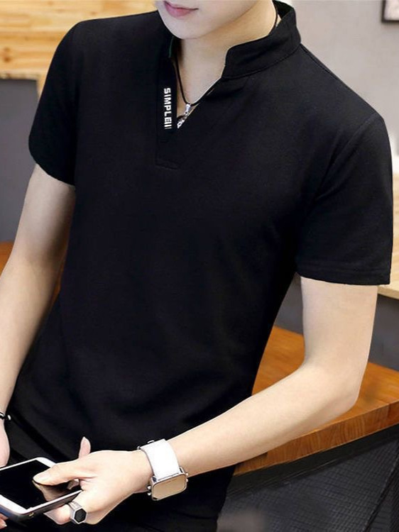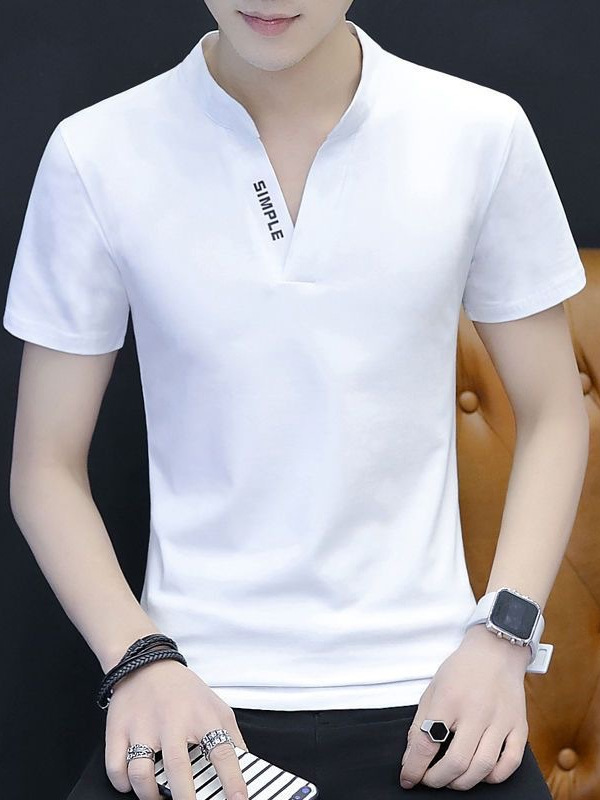 襟元のスタンドカラーデザインが特徴的なメンズ向けの白Tシャツです。