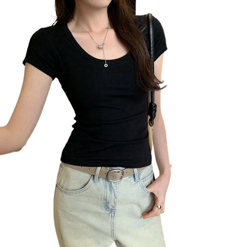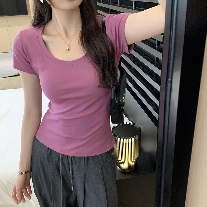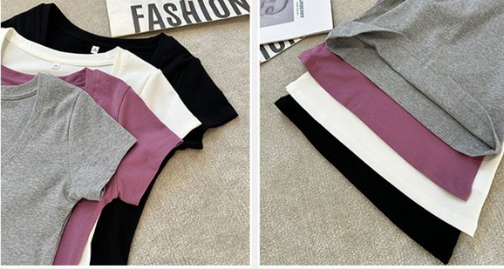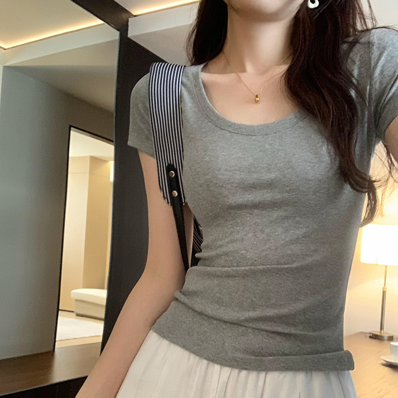 丸首のすっきりとしたネックラインと程よいフィット感が、女性らしいシルエットを演出します。