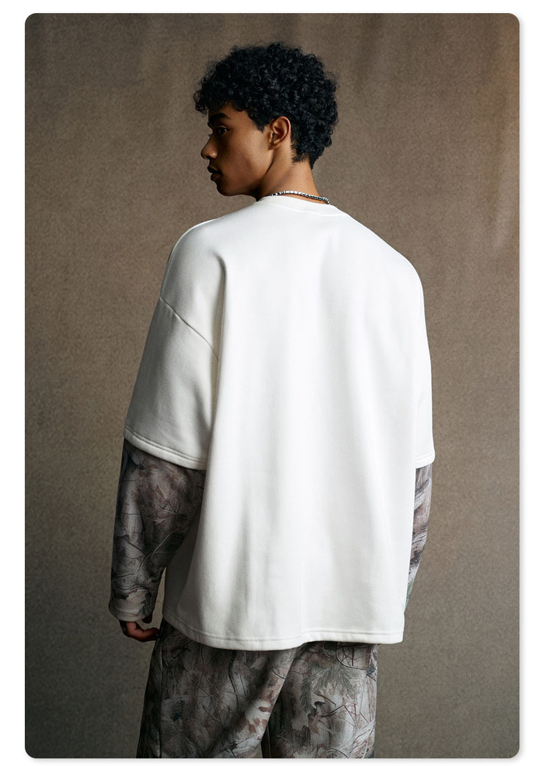 メンズに人気の白Tシャツに迷彩柄袖をプラスした重ね着風デザイン。