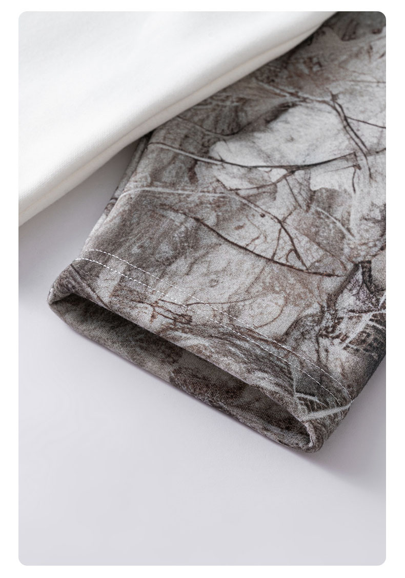白Tシャツの清潔感と迷彩袖のカジュアル感が絶妙にマッチし、一枚でおしゃれが完成します。